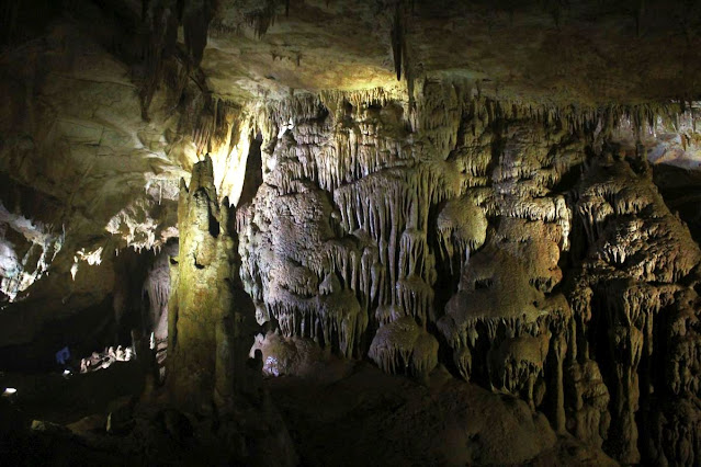 След 2,5 км пеша стигнах до паркинга и входа на пещерата. Докато вървях, хапвах райски ябълки, които ми беше дал шофьорът Джорджи. Явно добре виреят в Грузия, защото видях дръвчета по доста дворове. Пещерата се оказа твърде туристическа за моя вкус, но въпреки това реших да я видя. Щеше да е къде по-хубаво ако беше "необлагородена". Билетът беше 23 лари, а ако искаш и разходка с лодка нататък в пещерата след посещението на пешеходната част, доплащаш още 17 лари. Направо идеална машина за лесни пари. Аз си взех билет само за пешеходната част, но без малко и за това да съжаля. През цялото време се върви като стадо, влиза се на групи и не само отпред има екскурзовод, както е в България, но и отзад има пъдарин, който върви след последния (който винаги, навсякъде съм аз). Така не можеш спокойно да се отцепваш от овцете и да разглеждаш по-обстойно. Иначе пещерата е била невероятна преди да се излеят тонове бетон за пътеките в нея и цялата да светне с шарени лампи като долнопробна дискотека. Жалко, че това са разбиранията на хората за "облагородяване". А образуванията са много красиви и разнообразни, природата е сътворила едно подземно чудо, осрано от човека. Много ми се искаше да я видя тази пещера преди хората да й посегнат... Дълга е 11 км, от които само 1 км се посещава от туристи. Има 22 зали, от които се влиза само в 6. Тоест като обикновен посетител виждаш съвсем малка част от пещерата. Въобще не обичам така... нали изкарах курс за пещерняк, че да ги обхождам максимално пещерите, а не само първите метри и обратно.