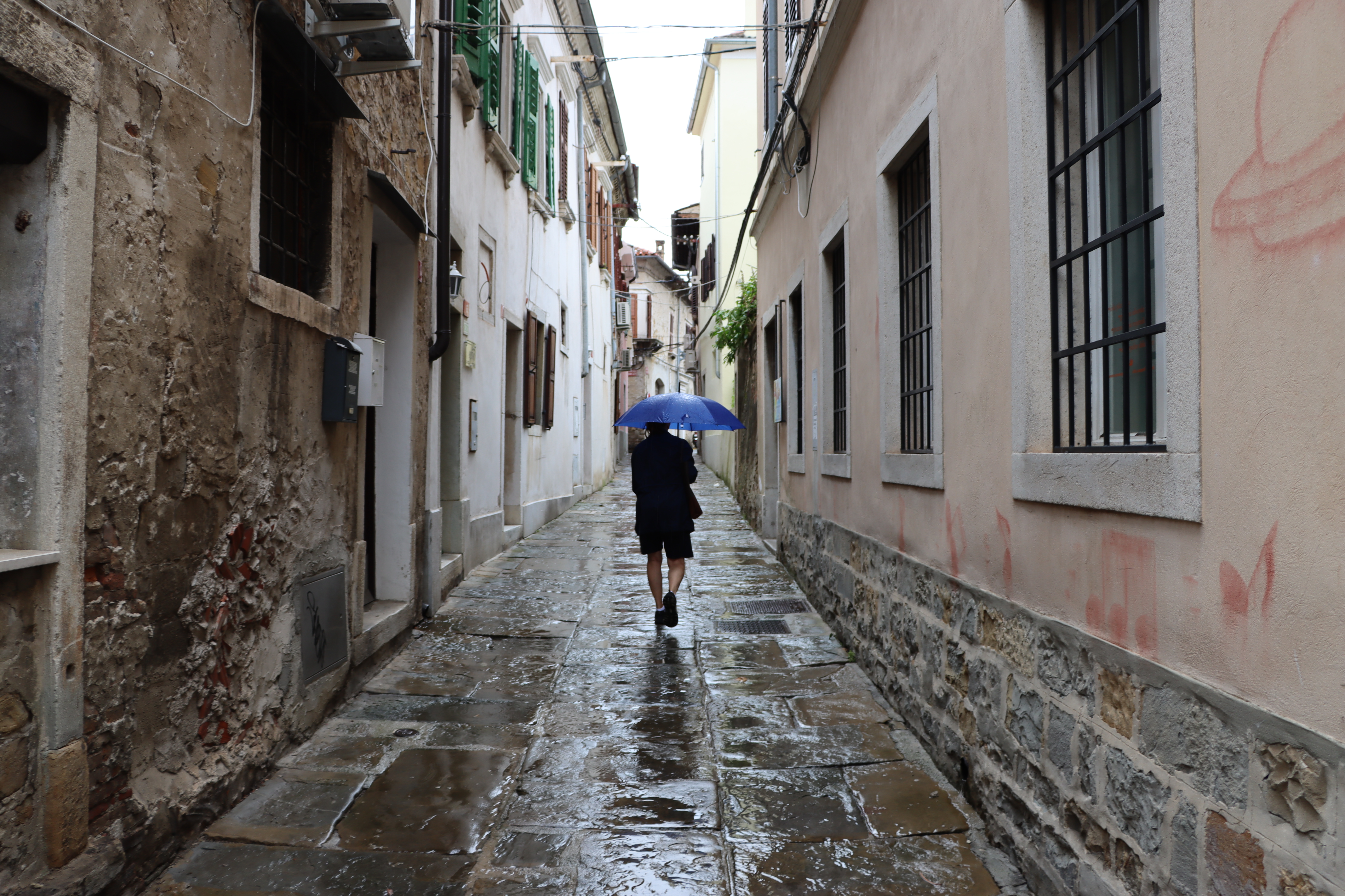 За съжаление предстоеше да видим твърде малко от страната днес, вече бяхме закъснели от първоначалния ми план с много дни и вероятно изобщо нямаше да стигнем до Франция. Така и стана - не стигнахме. Италия тотално ни погълна. В Словения първо посетихме малка църква след границата - Saint Quirico, близо до селцето Sočerga. Чаровна църква от 11 век с гробище, една от най-старите в страната, но за жалост беше затворена и я видяхме само отвън. Продължихме към Копер, но за лош късмет дъждът се усили и нямаше намерение да спира. От планинските селски пътчета се спуснахме към морето и стигнахме големия крайбрежен град. Валеше брутално и решихме да влезем да напазарим храна в Лидл, докато чакаме да спре, че да се разходим. Паркингът на Лидл беше 120 минути безплатно и реших да местим колата другаде, за да може да се разходим из центъра спокойно. Голяма грешка - въртях ли въртях, обаче всички останали магазини бяха с платени паркинги за мой голям потрес. Как може да се плаща за паркинг на магазин, където отиваш да пазаруваш - не проумявам. Накрая пак се озовахме на Лидл и оставихме там колата с идеята да се върнем в рамките на безплатното време. Тъкмо беше спряло да вали и обходихме добре центъра, беше доста по-семпъл от хърватските градове. Аз също за първи път посетих Копер и се радвах, че мама успя да види поне един словенски град. Върнахме се до буса след около час и не пресрочихме паркинга.